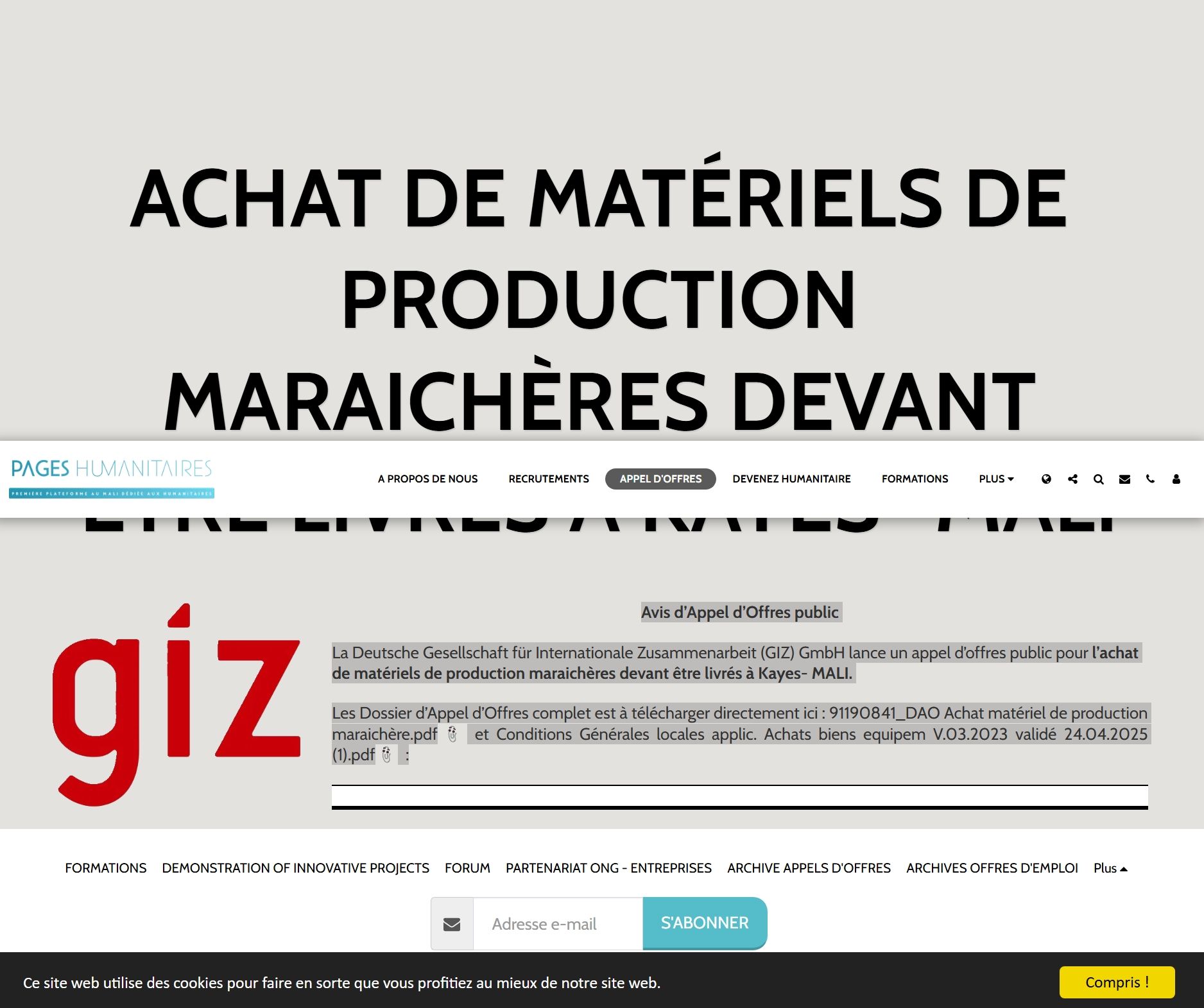 Les Dossier d’Appel d’Offres complet est à télécharger directement ici : 91190855_DAO Achat matériel de production maraichère.pdf et Conditions Générales locales applic. Achats biens equipem V.03.2023 validé 24.04.2025.pdf