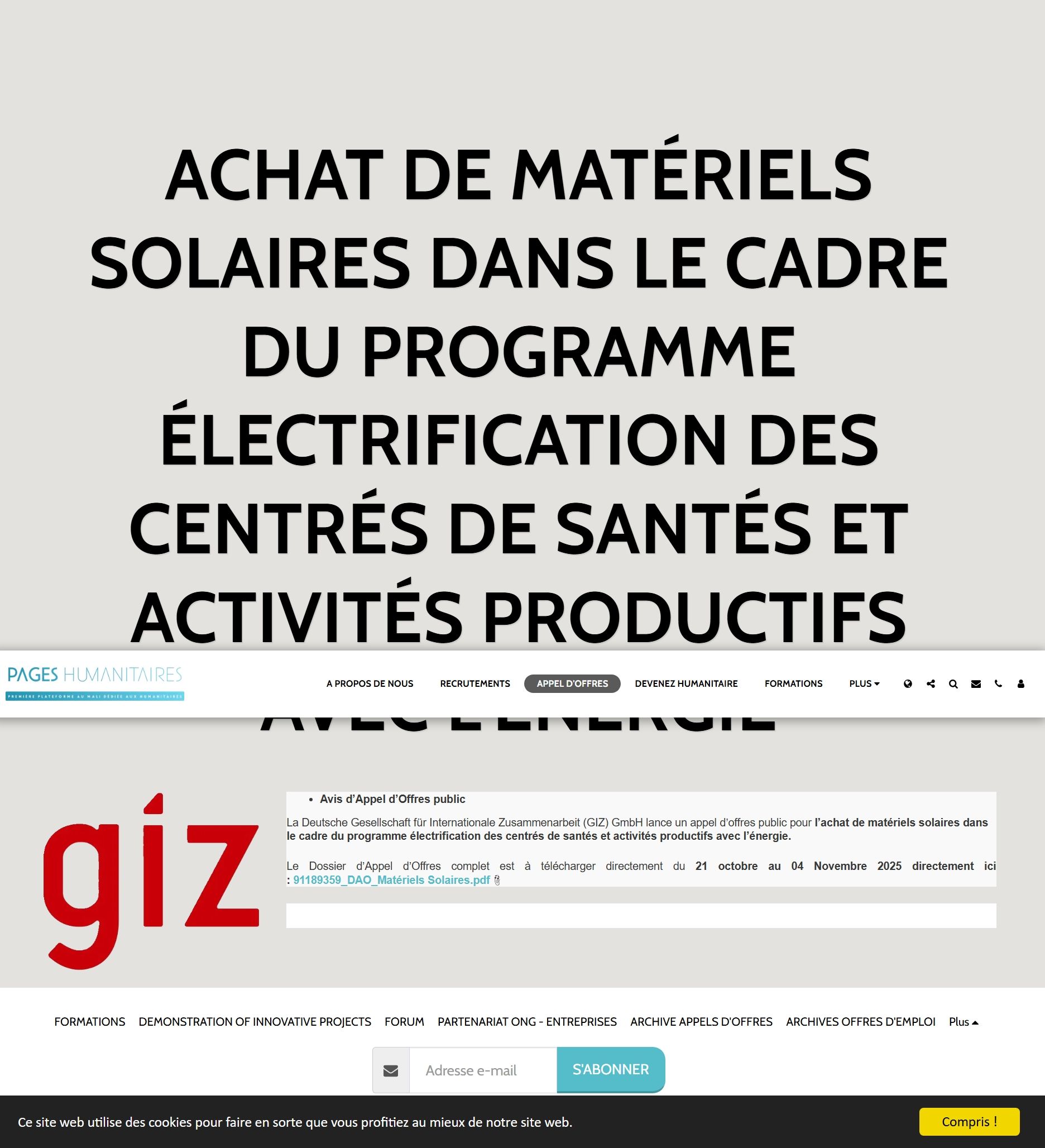 - La Deutsche Gesellschaft für Internationale Zusammenarbeit (GIZ) GmbH lance un appel d’offres public pour l’achat de matériels solaires dans le cadre du programme électrification des centrés de santés et activités productifs avec l’énergie.