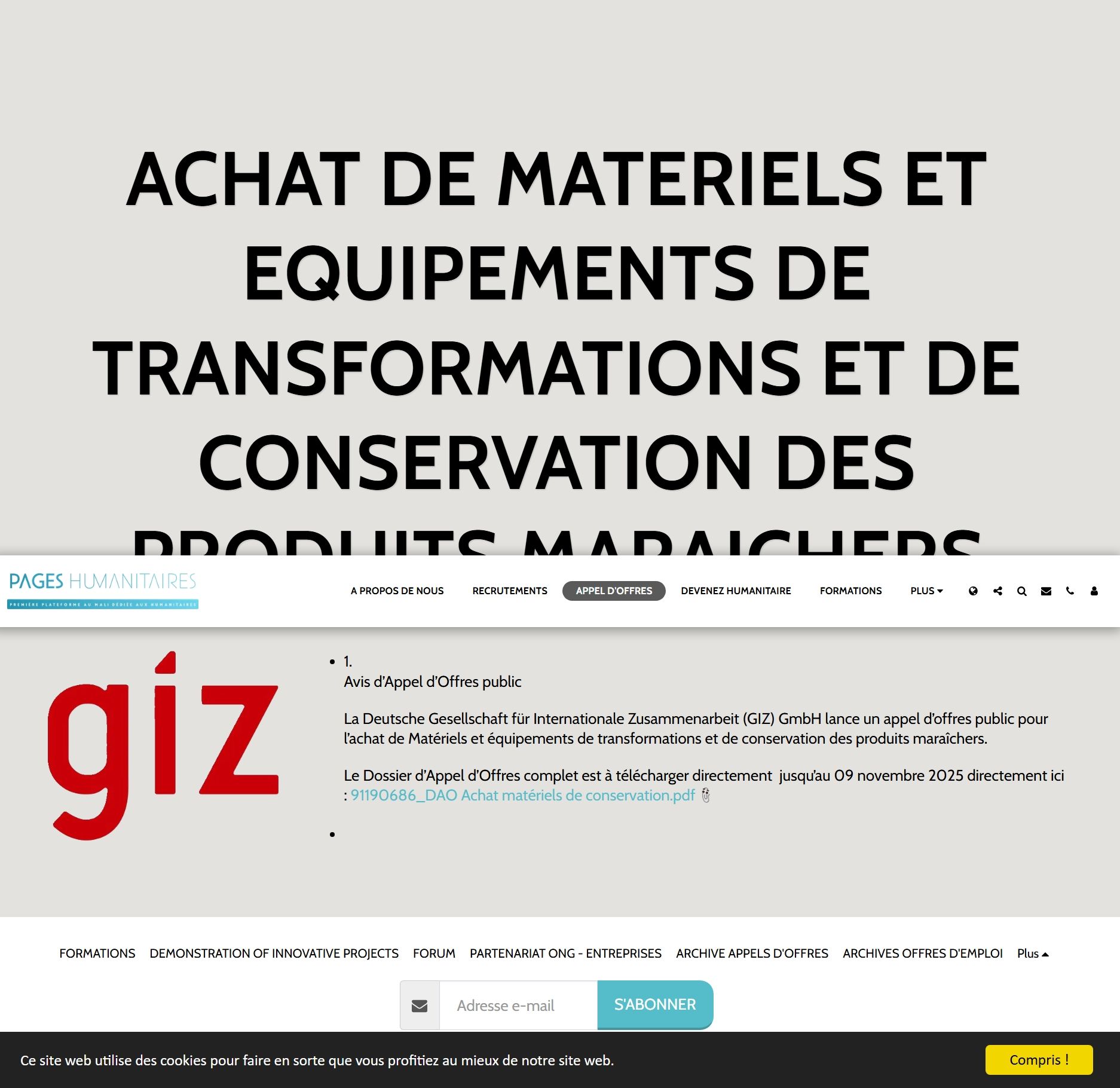 ACHAT DE MATERIELS ET EQUIPEMENTS DE TRANSFORMATIONS ET DE CONSERVATION DES PRODUITS MARAICHERS