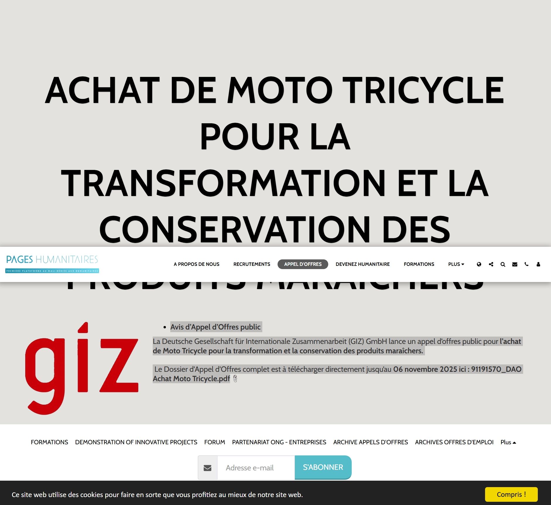 La Deutsche Gesellschaft für Internationale Zusammenarbeit (GIZ) GmbH lance un appel d’offres public pour l’achat de Moto Tricycle pour la transformation et la conservation des produits maraîchers.