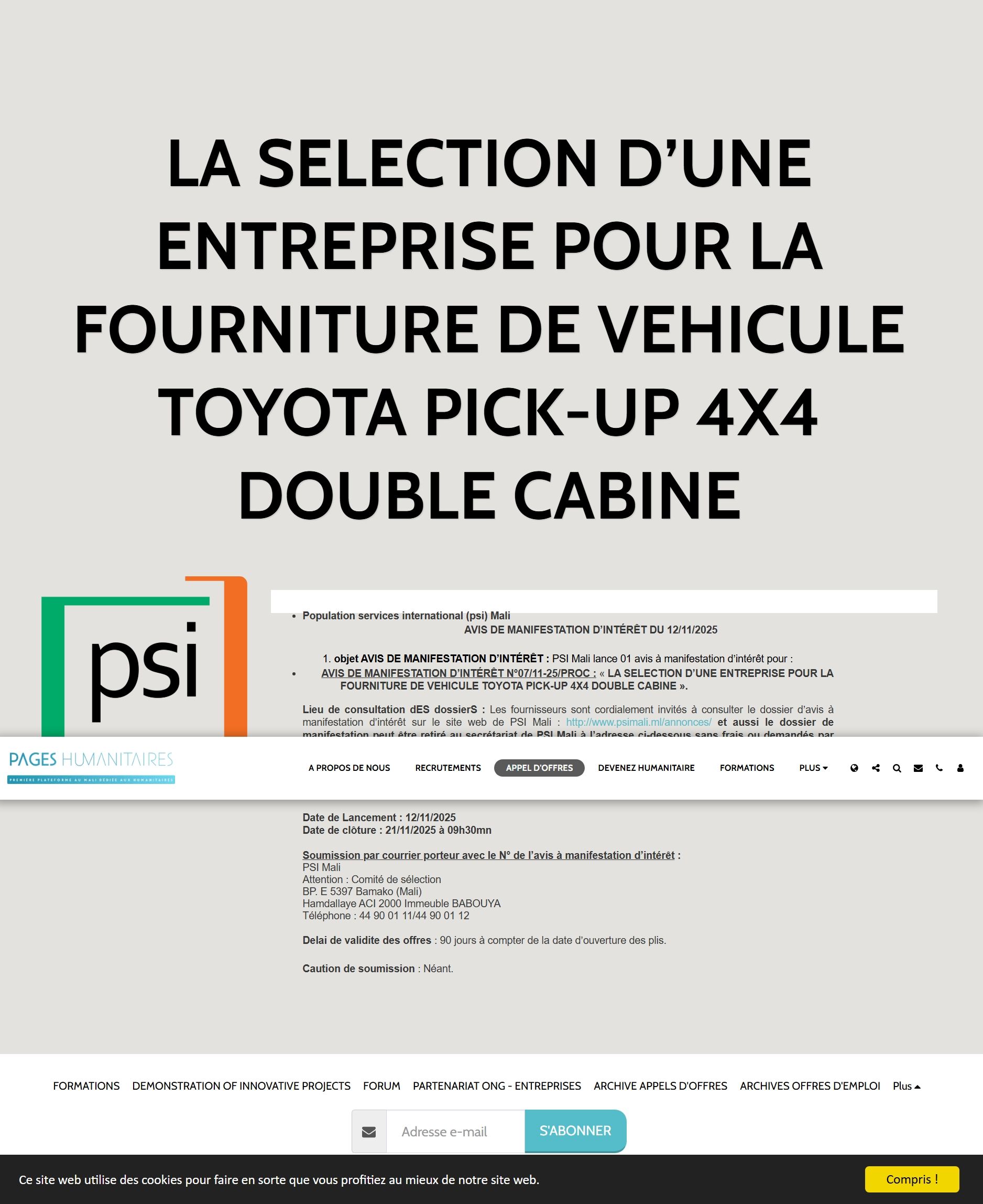 AVIS DE MANIFESTATION D’INTÉRÊT N°07/11-25/PROC : « LA SELECTION D’UNE ENTREPRISE POUR LA FOURNITURE DE VEHICULE TOYOTA PICK-UP 4X4 DOUBLE CABINE ».