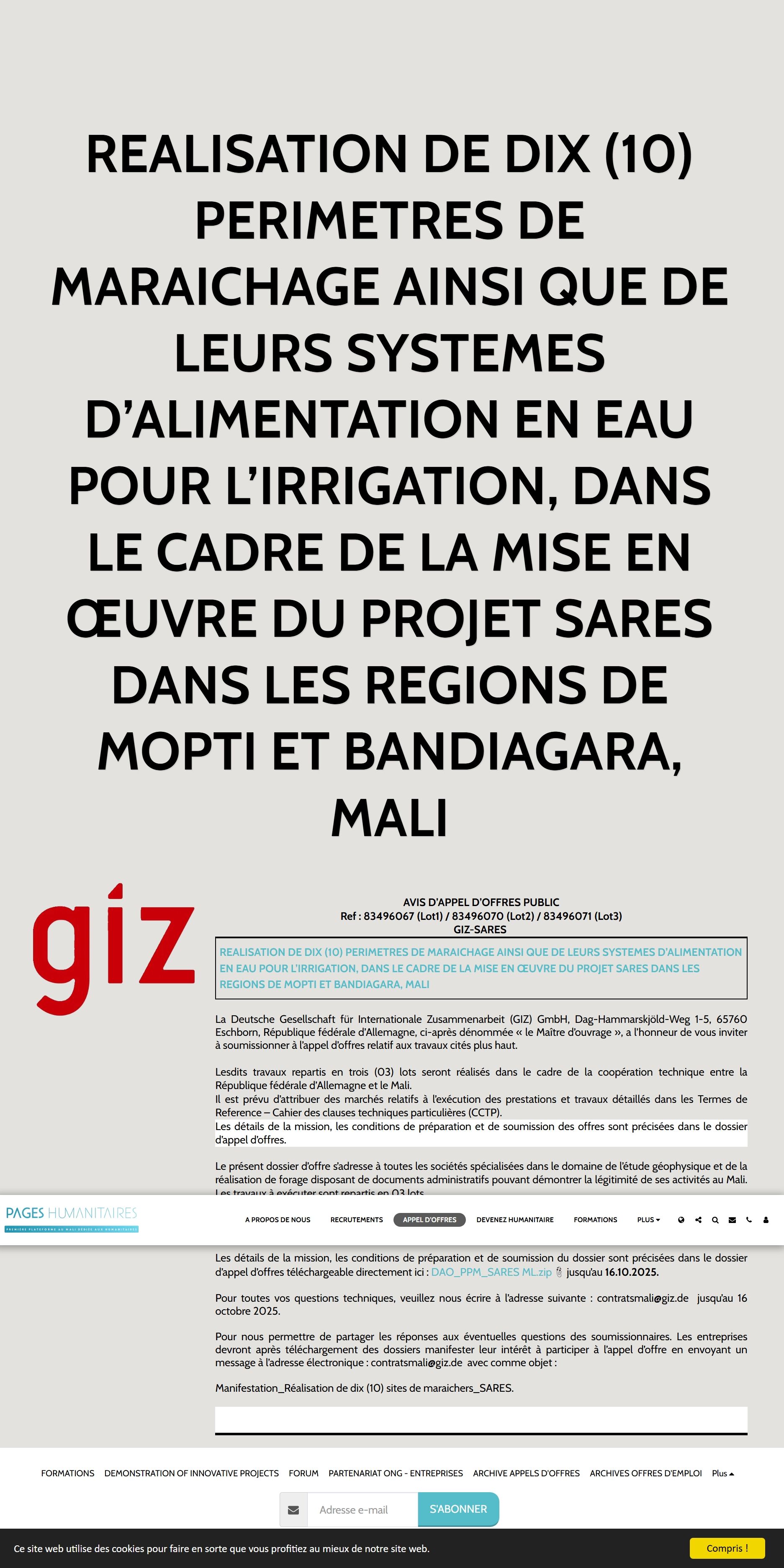 Les détails de la mission, les conditions de préparation et de soumission du dossier sont précisées dans le dossier d’appel d’offres téléchargeable directement ici : DAO_PPM_SARES ML.zipjusqu’au 16.10.2025.