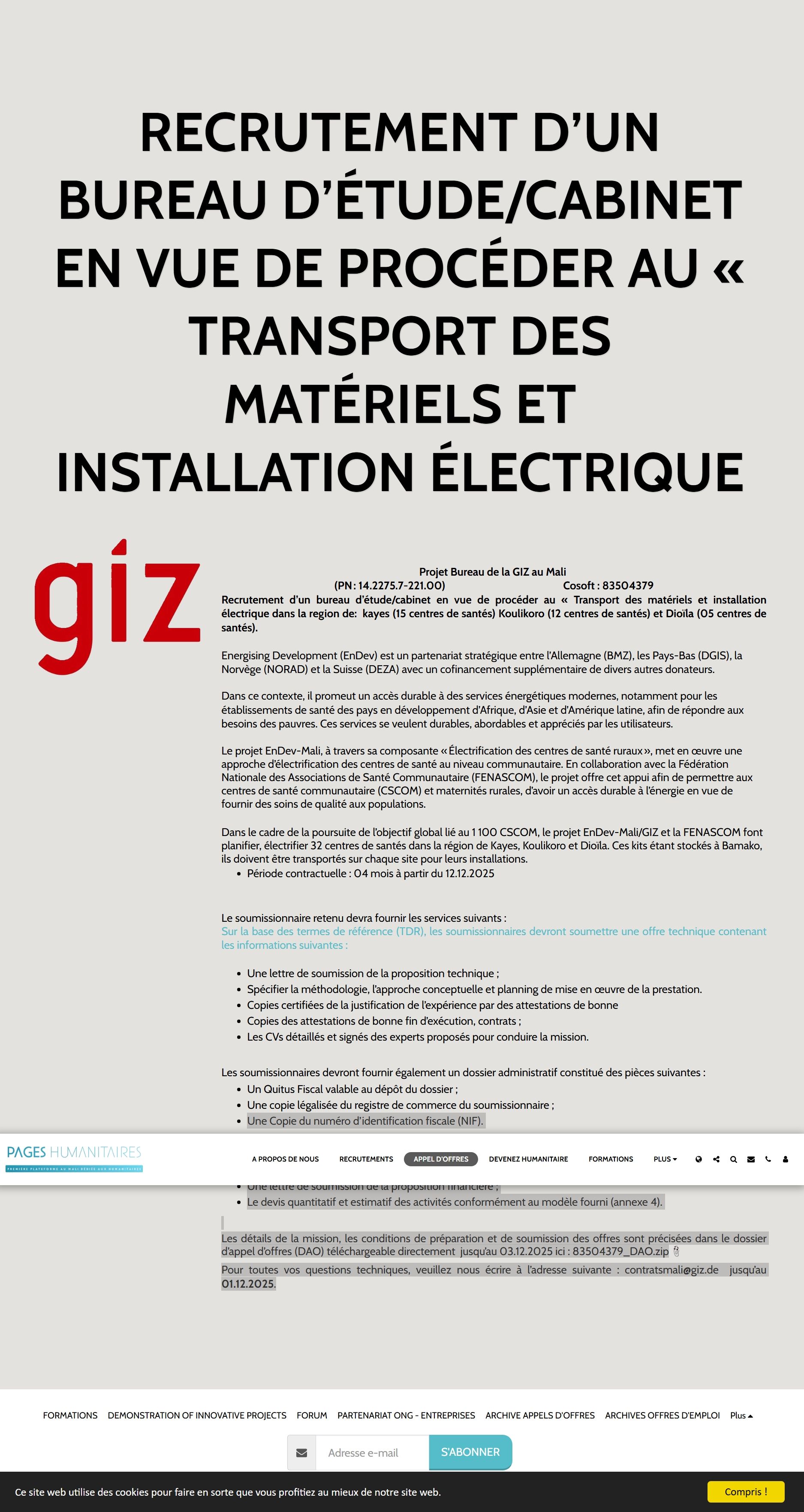 Pour toutes vos questions techniques, veuillez nous écrire à l’adresse suivante : contratsmali@giz.de jusqu’au 01.12.2025.