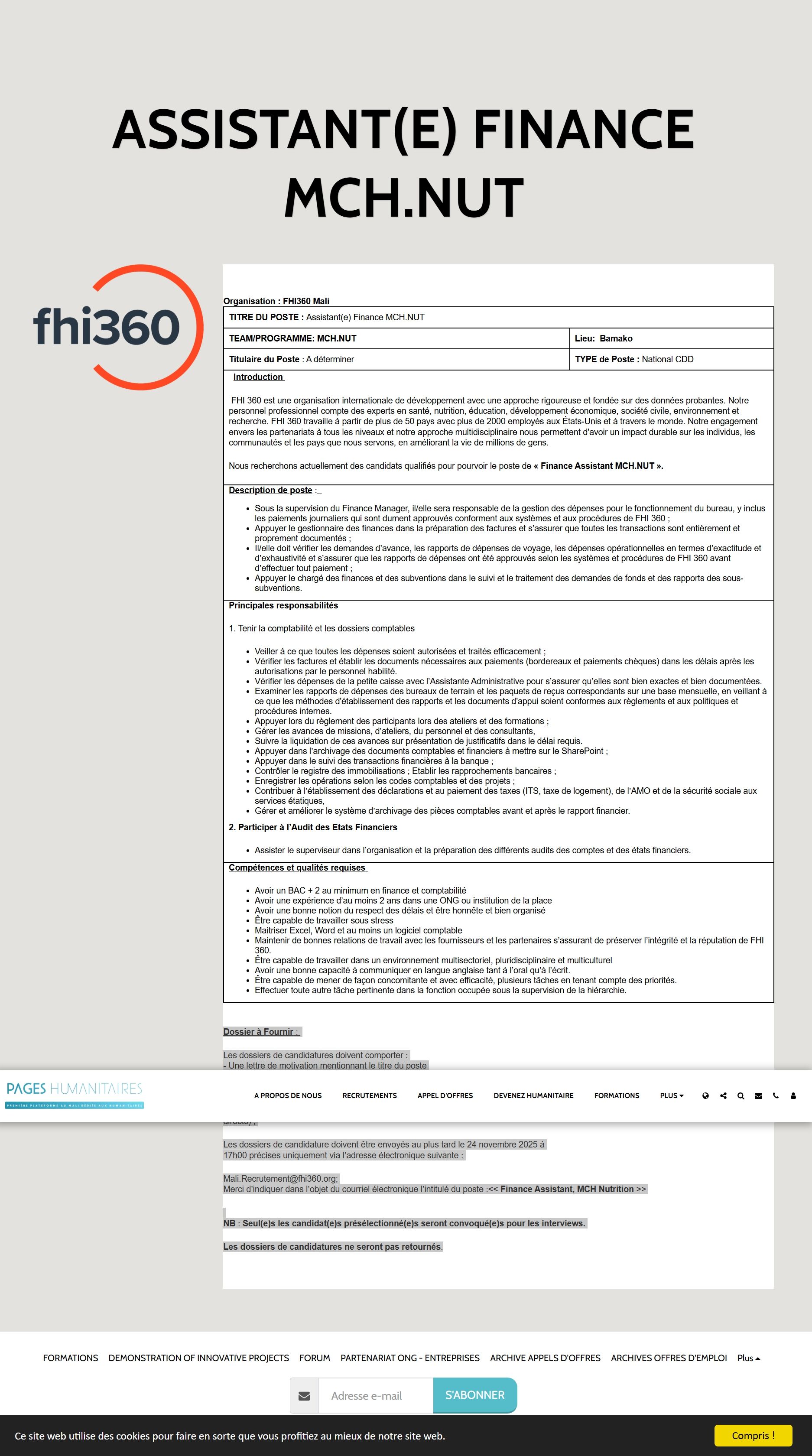 TITRE DU POSTE : Assistant(e) Finance MCH.NUT | |||