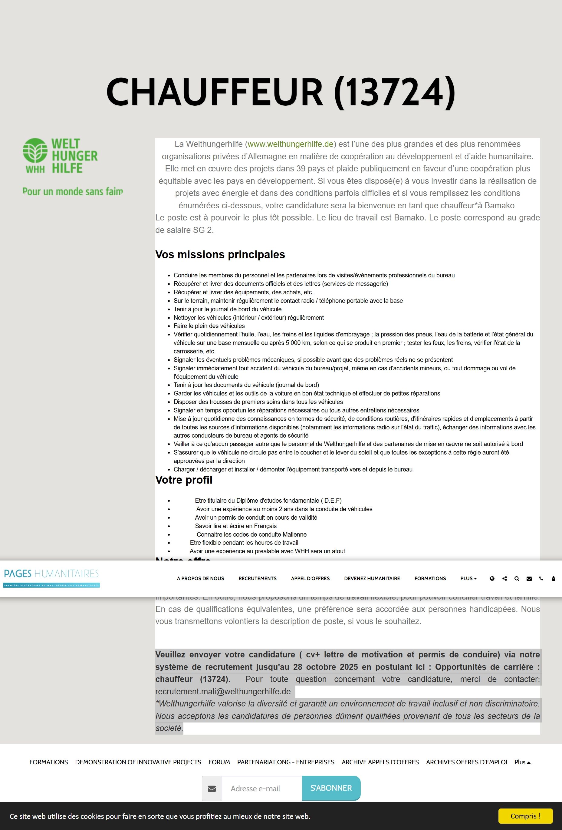 Veuillez envoyer votre candidature ( cv+ lettre de motivation et permis de conduire) via notre système de recrutement jusqu'au 28 octobre 2025 en postulant ici : Opportunités de carrière : chauffeur (13724). Pour toute question concernant votre candidature, merci de contacter: recrutement.mali@welthungerhilfe.de