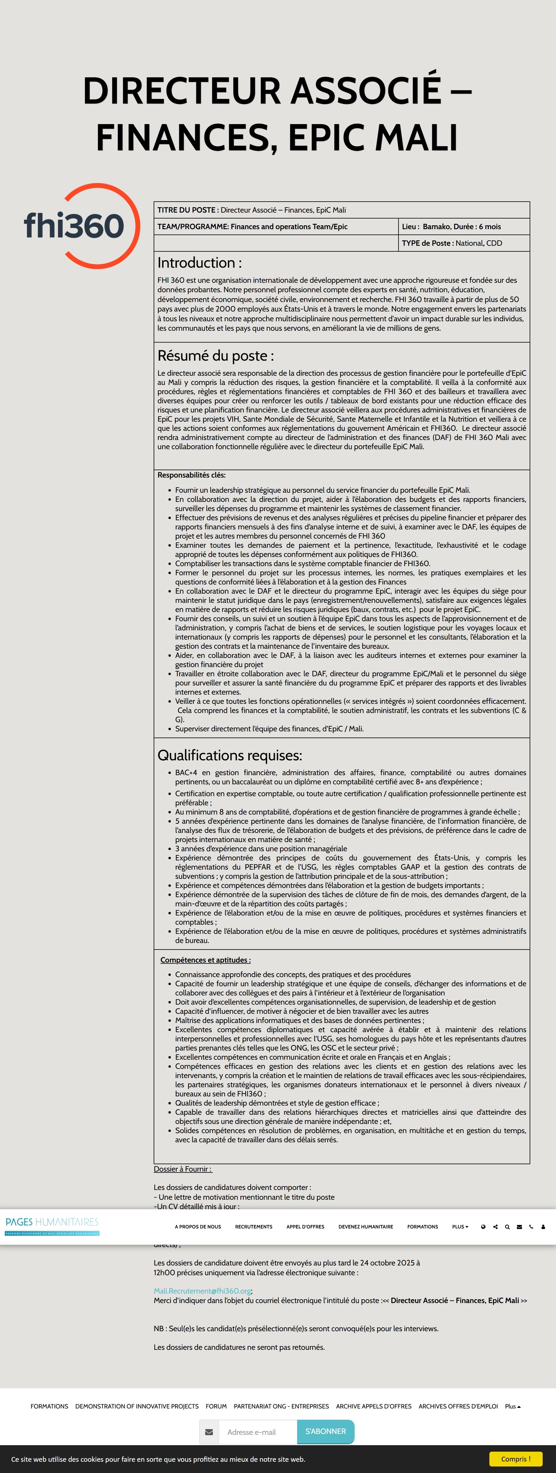 Dossier à Fournir : Les dossiers de candidatures doivent comporter : - Une lettre de motivation mentionnant le titre du poste -Un CV détaillé mis à jour ; - Les copies certifiées des diplômes et attestations de travail ; - Les contacts de trois références professionnelles (de préférence les superviseurs directs) ; Les dossiers de candidature doivent être envoyés au plus tard le 24 octobre 2025 à 12h00 précises uniquement via l’adresse électronique suivante : Mali.Recrutement@fhi360.org; Merci d’indiquer dans l’objet du courriel électronique l’intitulé du poste :<< Directeur Associé – Finances, EpiC Mali >> NB : Seul(e)s les candidat(e)s présélectionné(e)s seront convoqué(e)s pour les interviews.