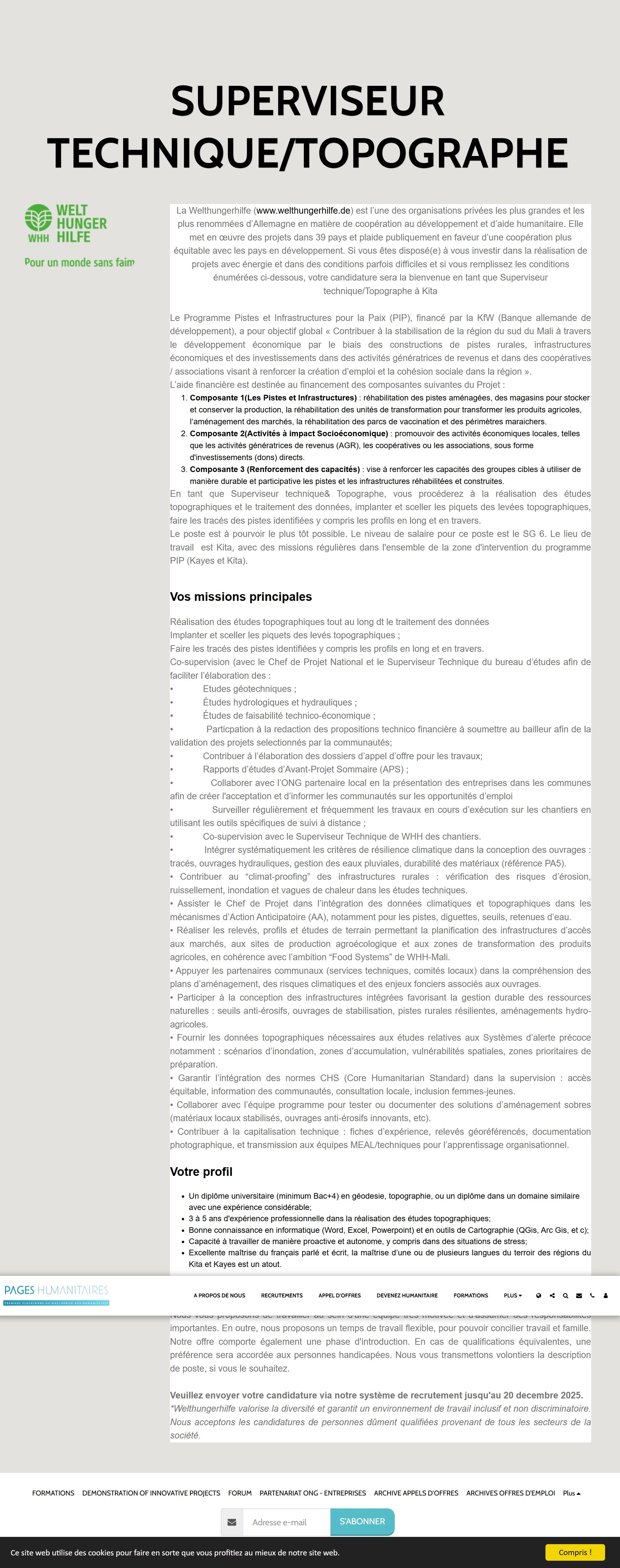 La Welthungerhilfe (www.welthungerhilfe.de) est l’une des organisations privées les plus grandes et les plus renommées d’Allemagne en matière de coopération au développement et d’aide humanitaire. Elle met en œuvre des projets dans 39 pays et plaide publiquement en faveur d’une coopération plus équitable avec les pays en développement. Si vous êtes disposé(e) à vous investir dans la réalisation de projets avec énergie et dans des conditions parfois difficiles et si vous remplissez les conditions énumérées ci-dessous, votre candidature sera la bienvenue en tant que Superviseur technique/Topographe à Kita