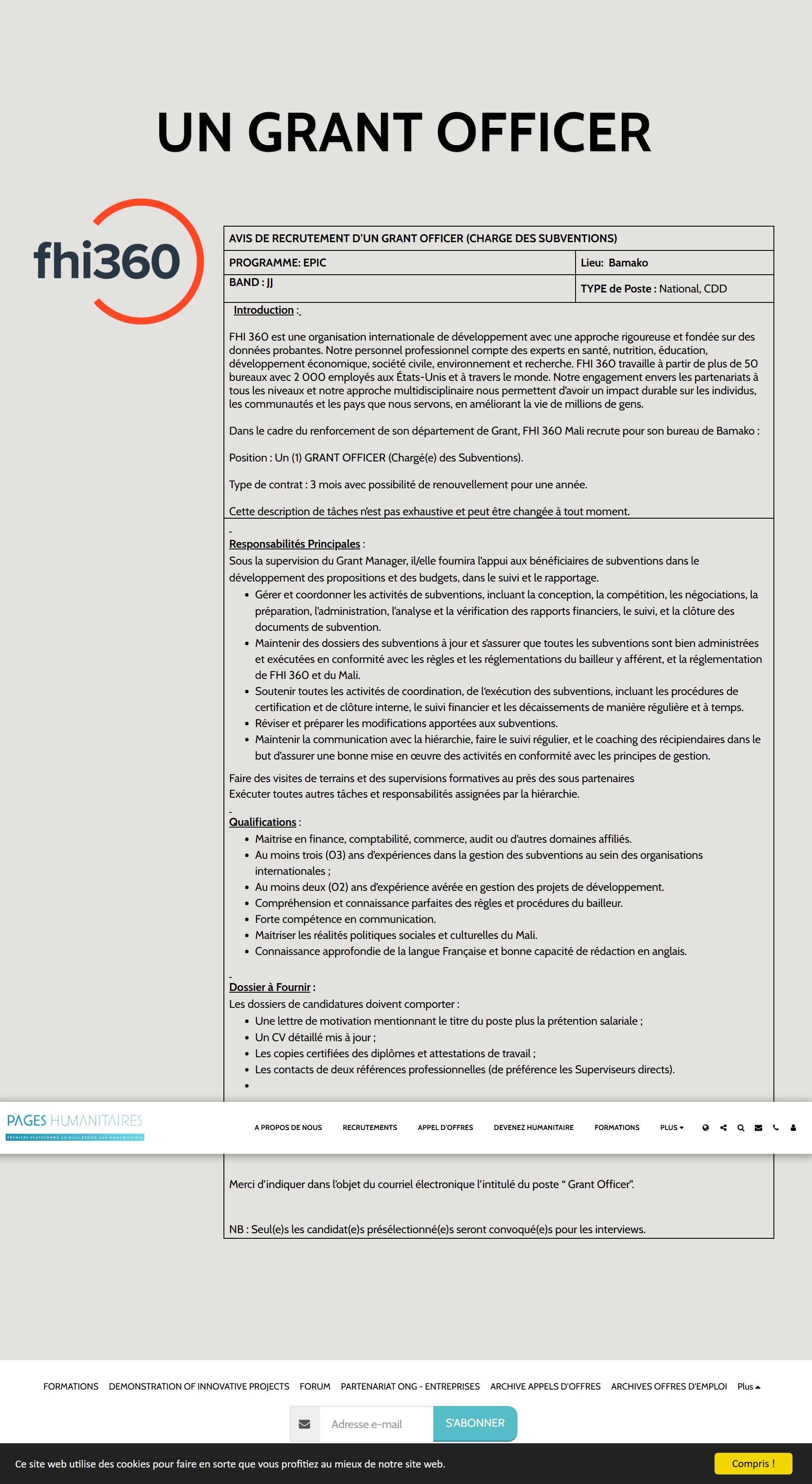 AVIS DE RECRUTEMENT D’UN GRANT OFFICER (CHARGE DES SUBVENTIONS) | |||