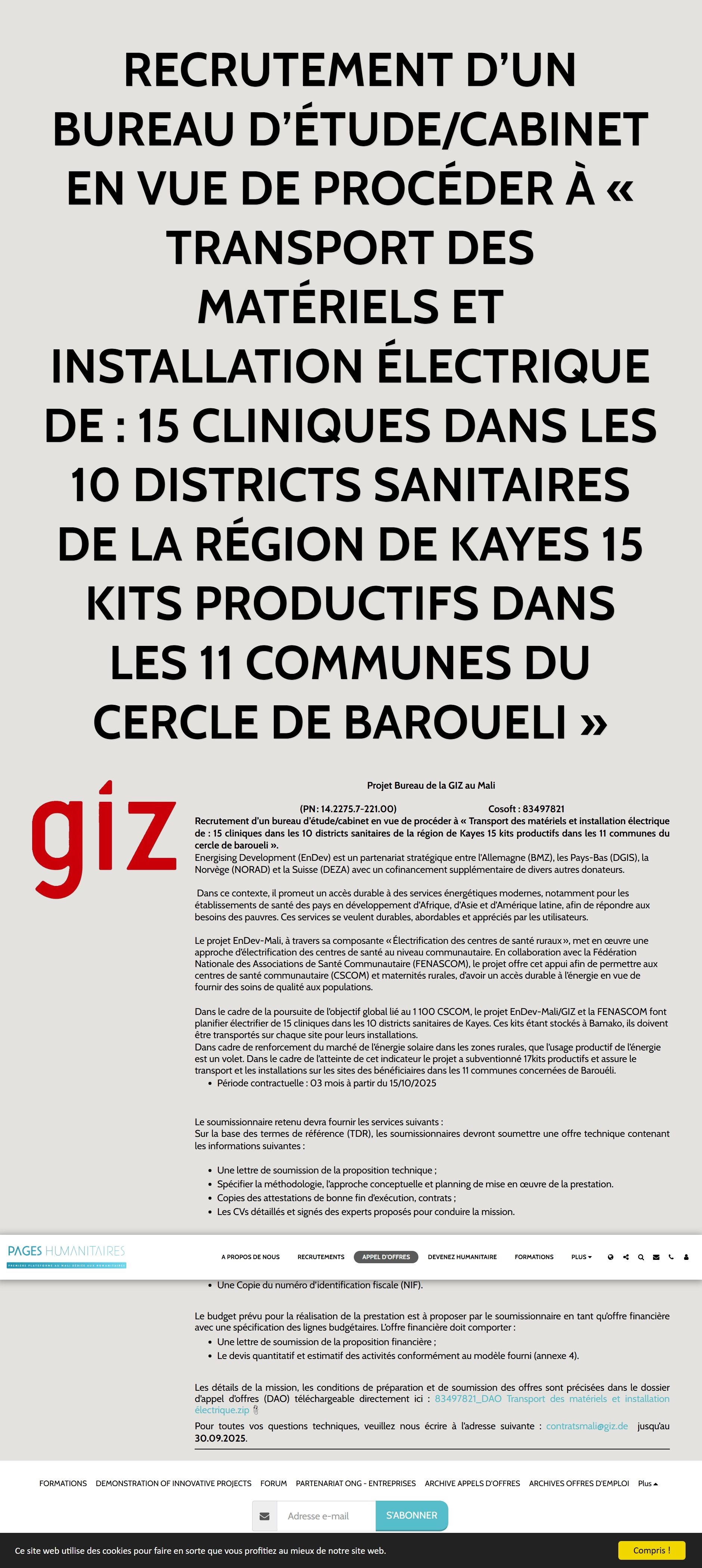 Recrutement d’un bureau d’étude/cabinet en vue de procéder à « Transport des matériels et installation électrique de : 15 cliniques dans les 10 districts sanitaires de la région de Kayes 15 kits productifs dans les 11 communes du cercle de baroueli ».