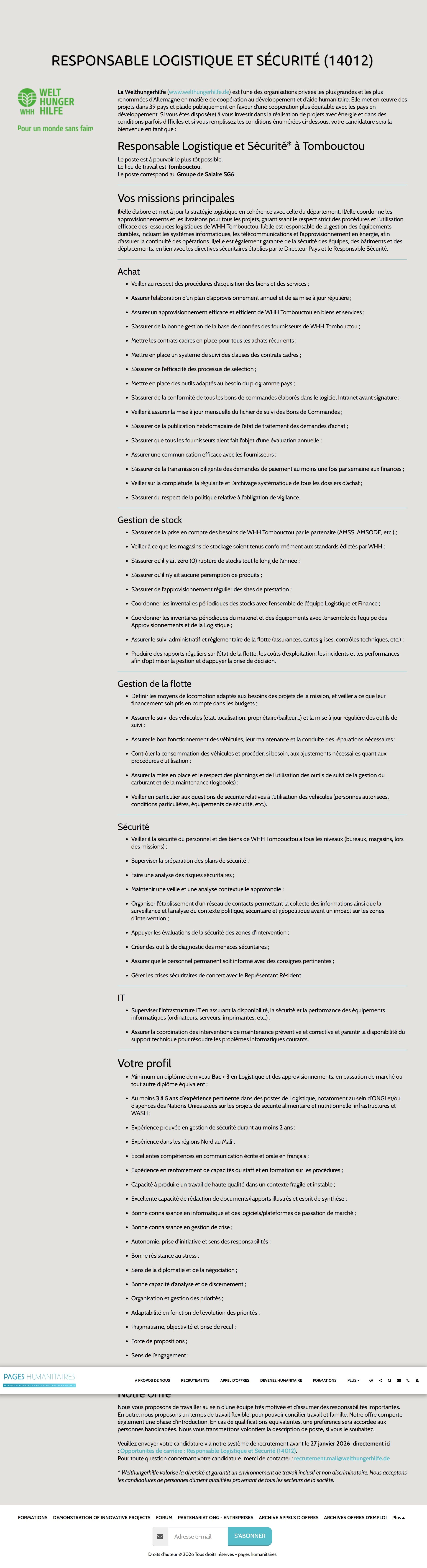 Veuillez envoyer votre candidature via notre système de recrutement avant le 27 janvier 2026 directement ici : Opportunités de carrière : Responsable Logistique et Sécurité (14012).