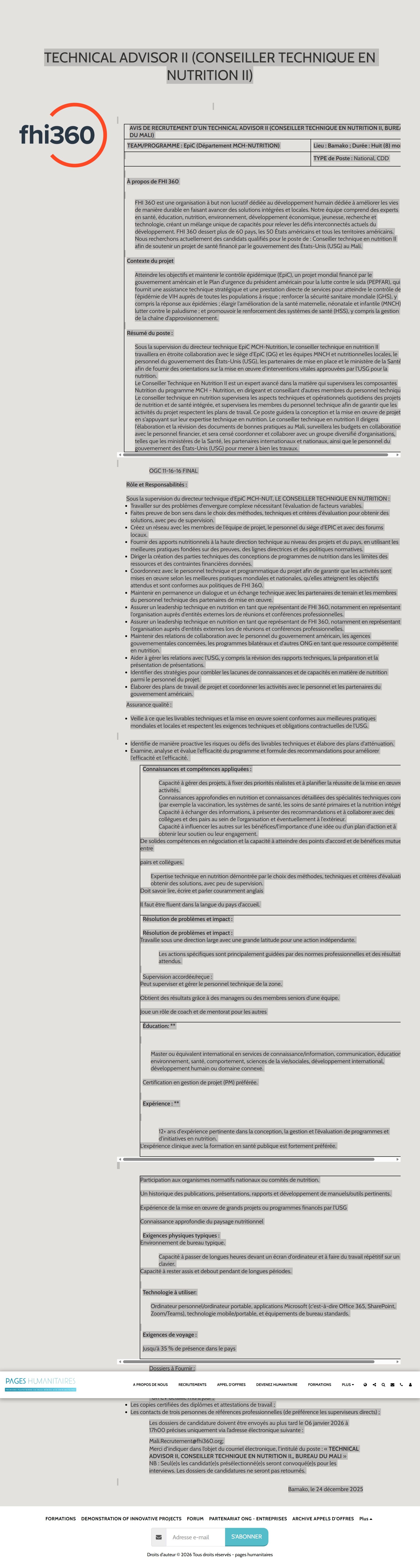 AVIS DE RECRUTEMENT D’UN TECHNICAL ADVISOR II (CONSEILLER TECHNIQUE EN NUTRITION II, BUREAU DU MALI) | |
